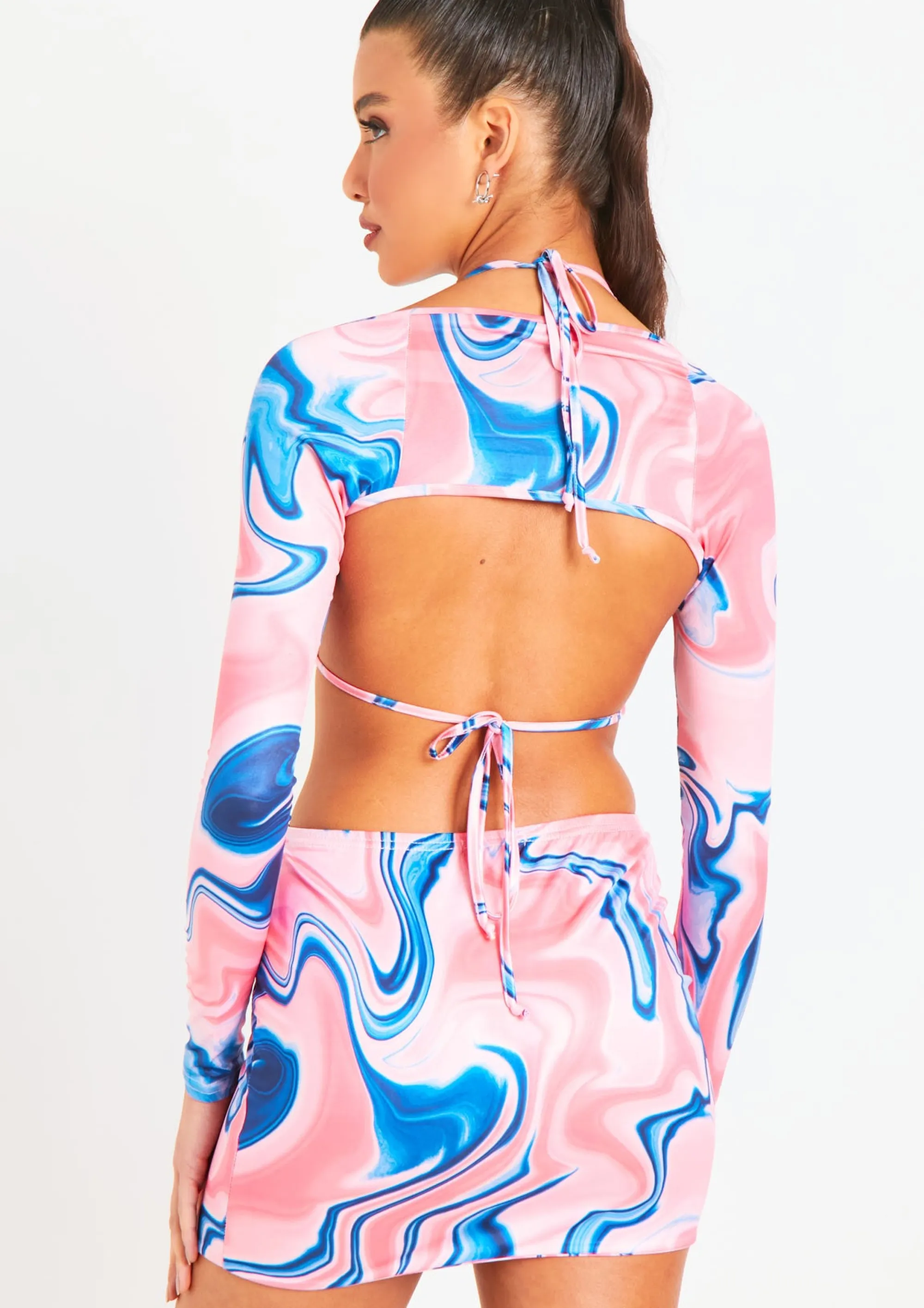 Ibiza? Festival? You Just Need Our Taliyah Pink Swirl Printed Top With Matching Bolero. In An Abstract Print Featuring A Bikini Top And Matching Bolero. Style With The Matching Skirt To Amp Up That Summer Look.