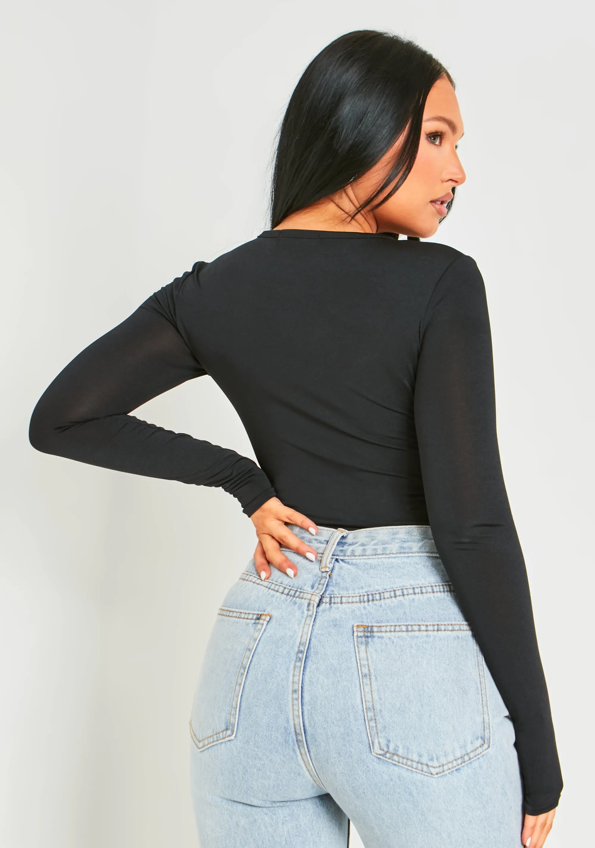 Keeping It Sexy With Our Bronte Black Cut Out Asymmetric Long Sleeve Bodysuit, Featuring A Cut Out Front Twist Detail In A Stretchy Material, Style With A Mini Skirt And Feels For The Party Season!