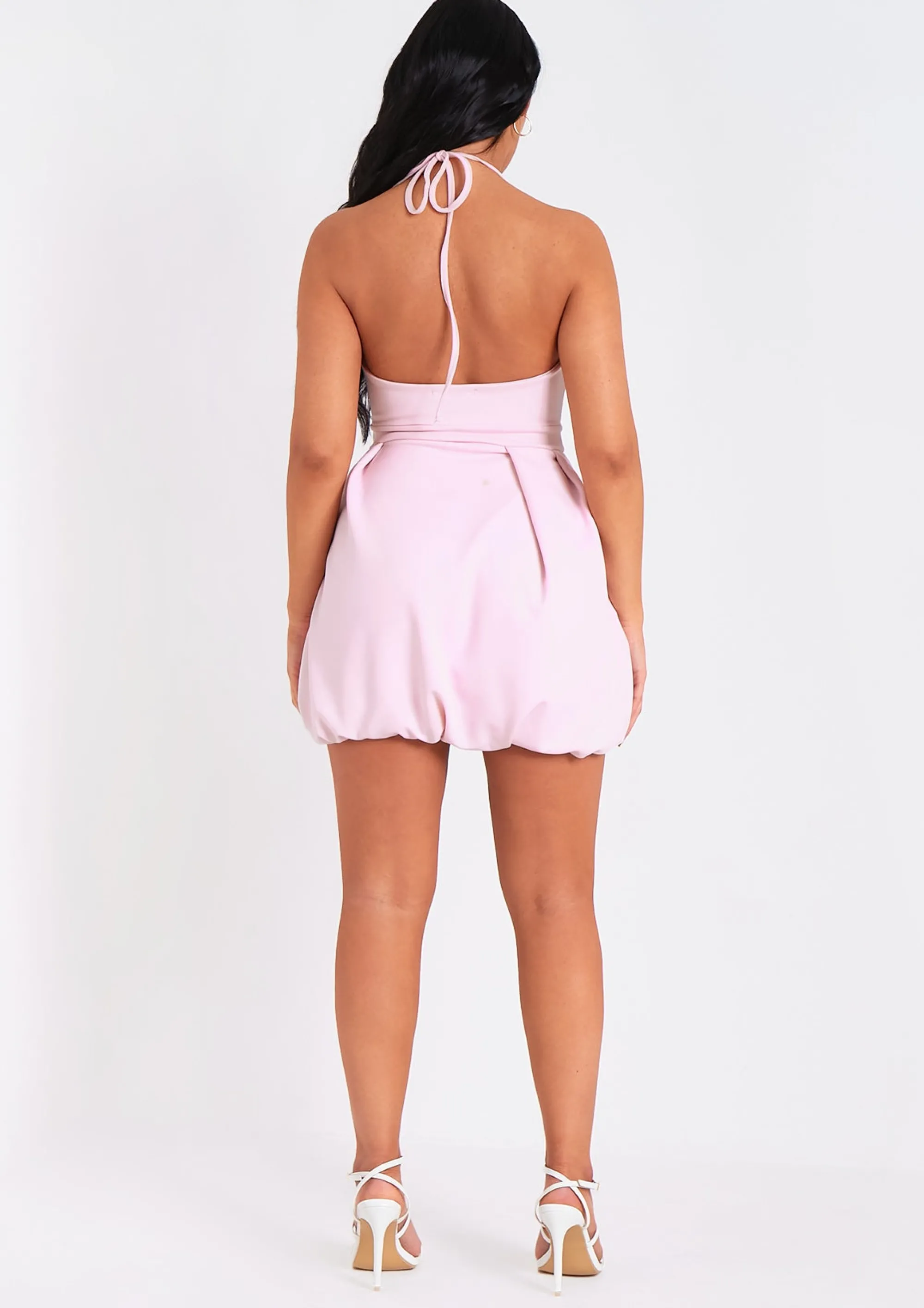 Pink Scuba Puffball Halter Neck Plunge Mini Dress