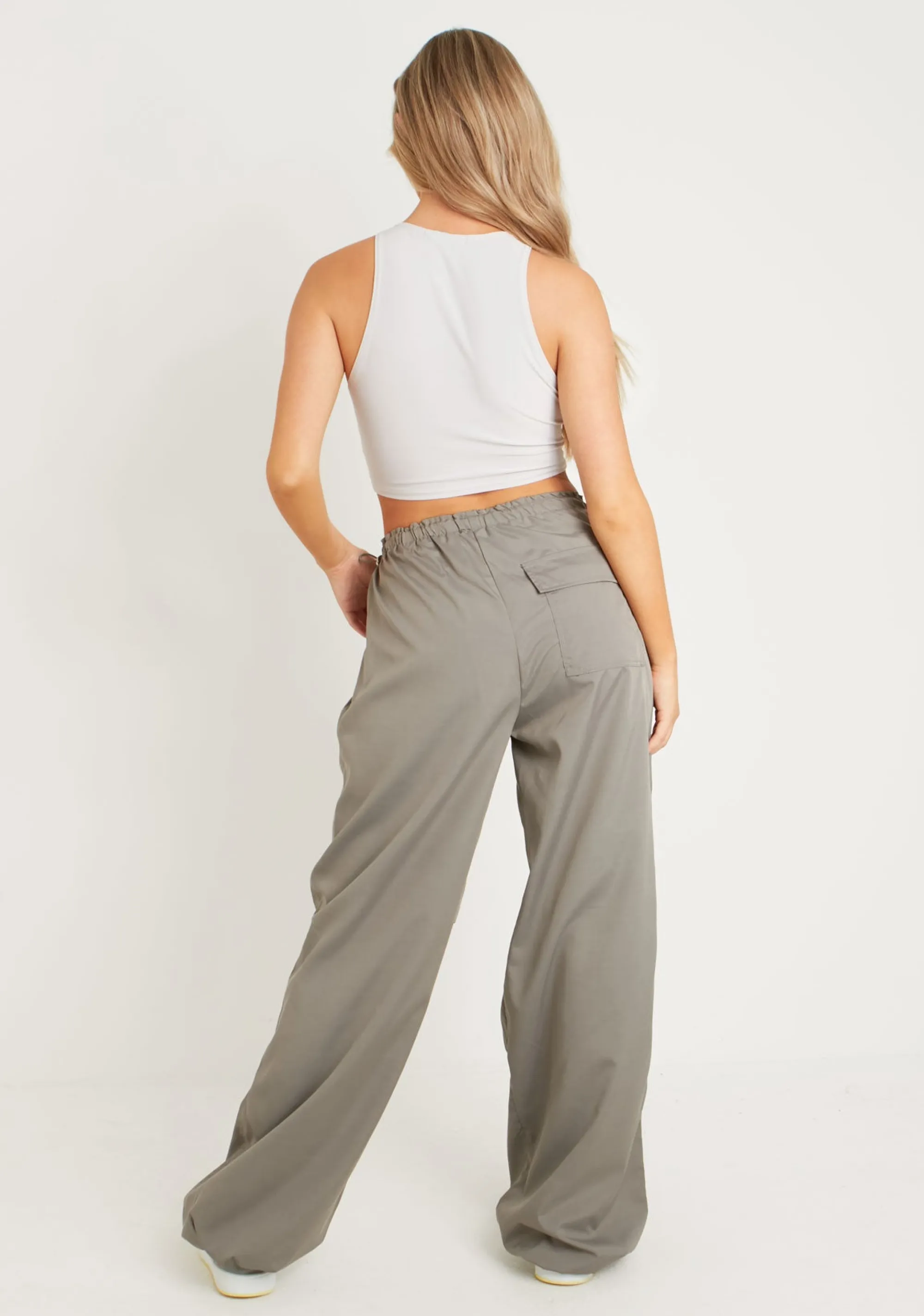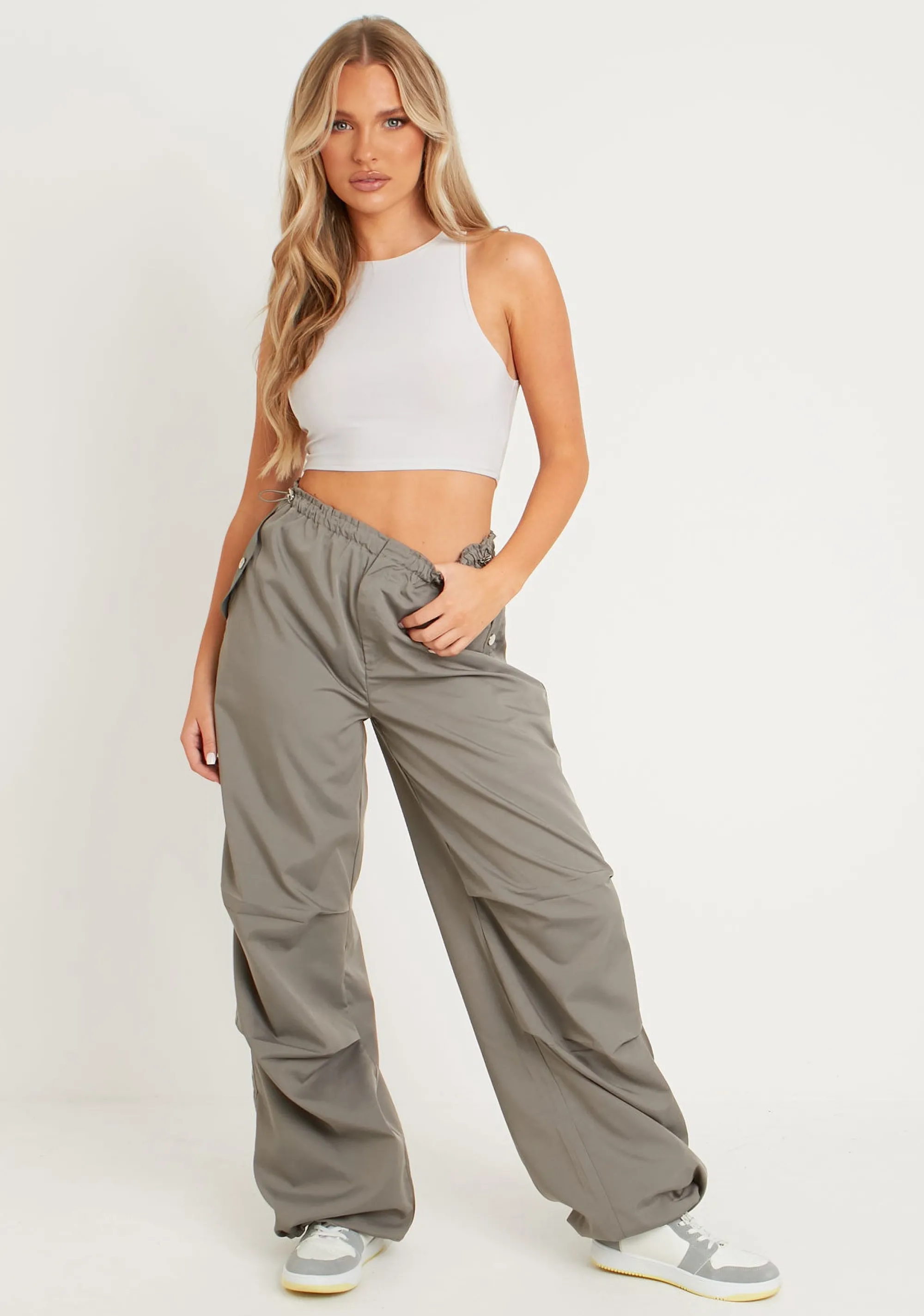 Get Super On-Trend Babe, In Our Samantha Charcoal Parachute Cargo Pants, Featuring An Oversized Parachute Fit With An Elasticated Toggle Waist. Style With Your Fave’ Trainers And A Lil’ Crop For A 90’s Vibe.