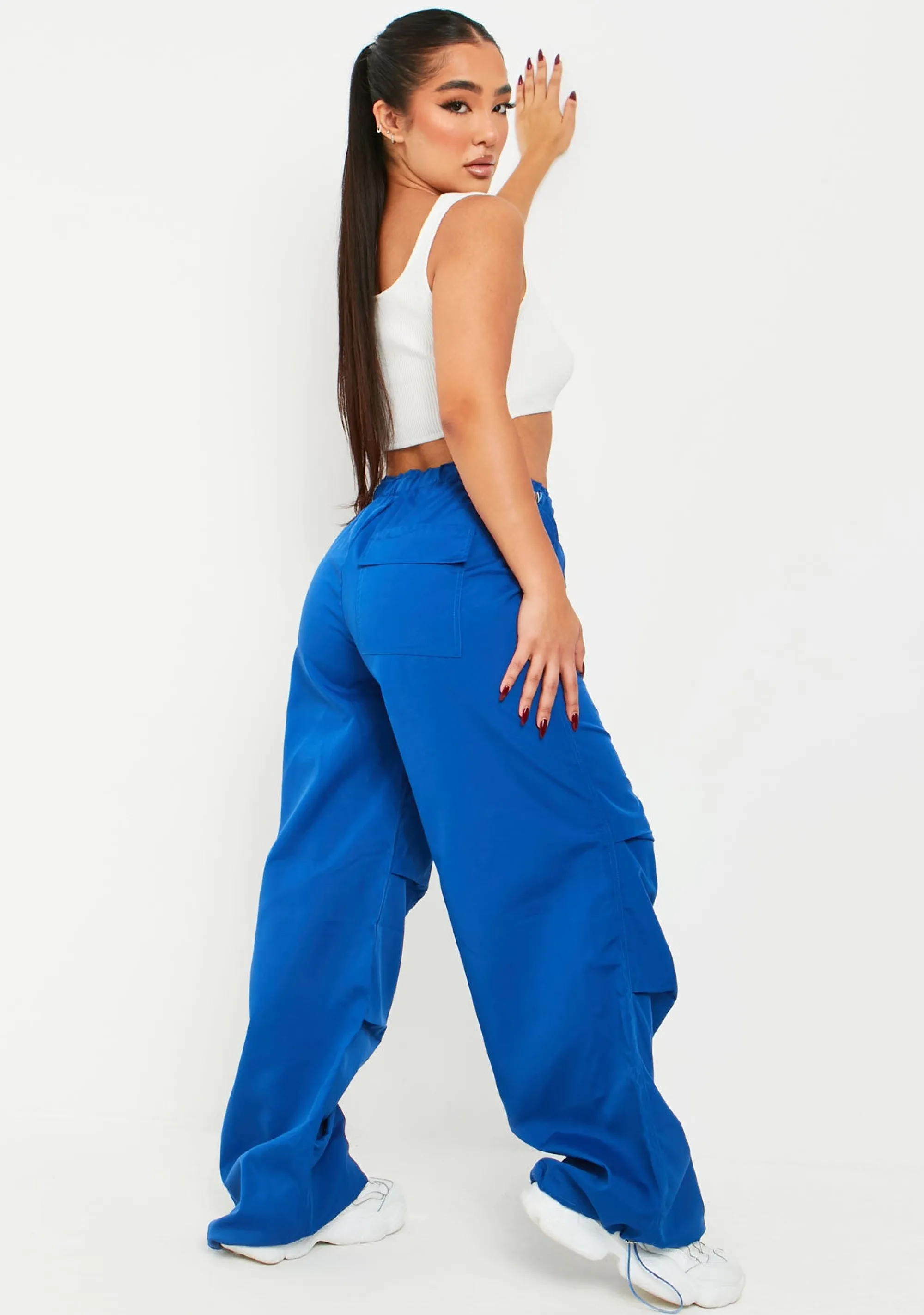 Get Super On-Trend Babe, In Our Samantha Cobalt Blue Parachute Cargo Pants, Featuring An Oversized Parachute Fit With An Elasticated Toggle Waist. Style With Your Fave’ Trainers And A Lil’ Crop For A 90’s Vibe.