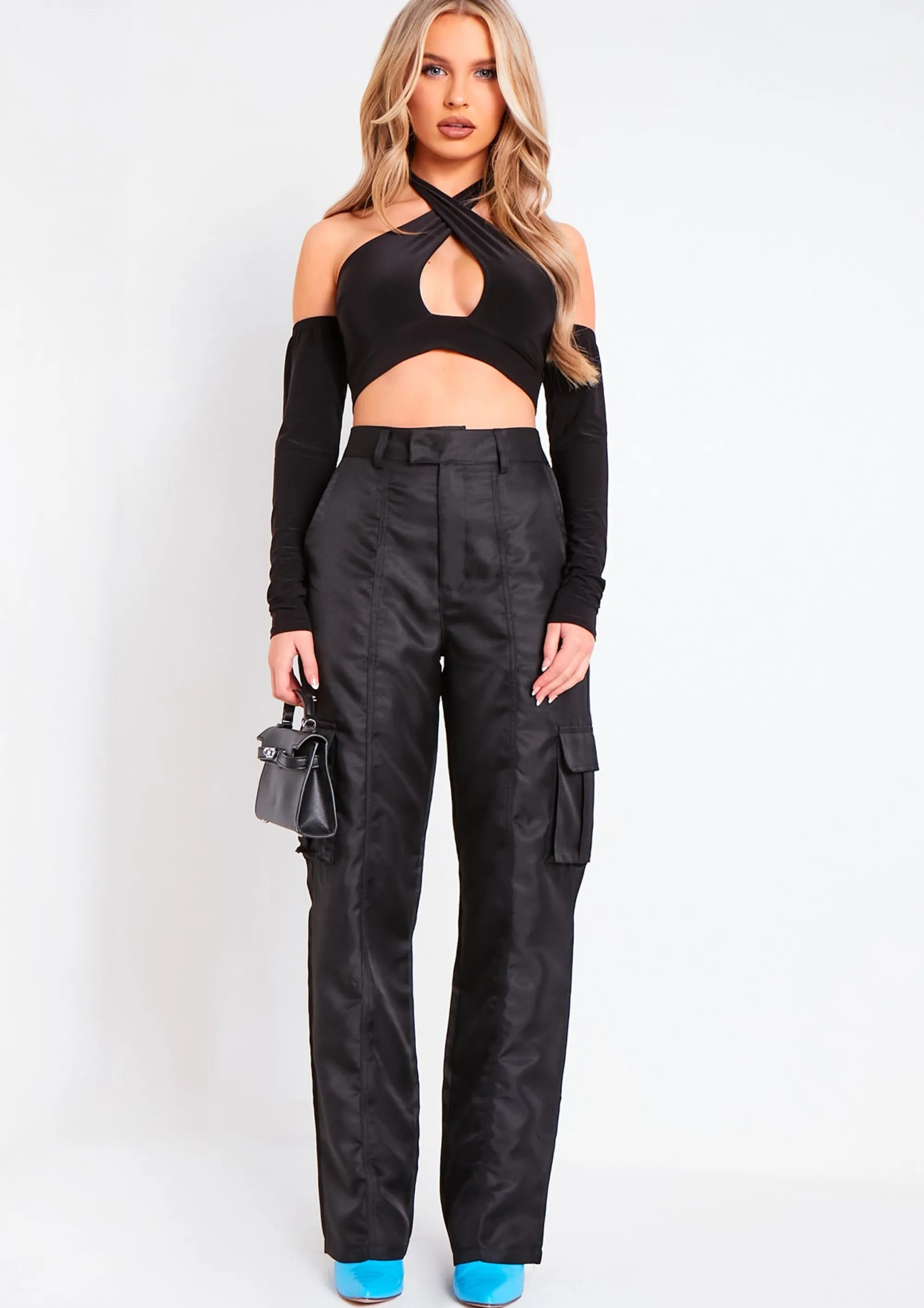 Baby, We Like Your Style! Our Saoirse Black Cross Halter Neck Top With Sleeves Features A Cross Halter Neck And Cold Shoulders, Finished In A Cropped Length.